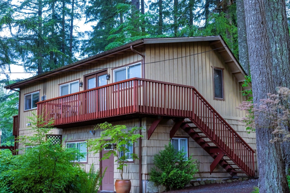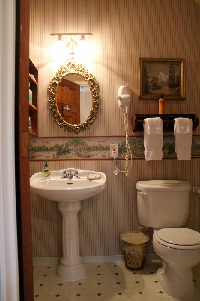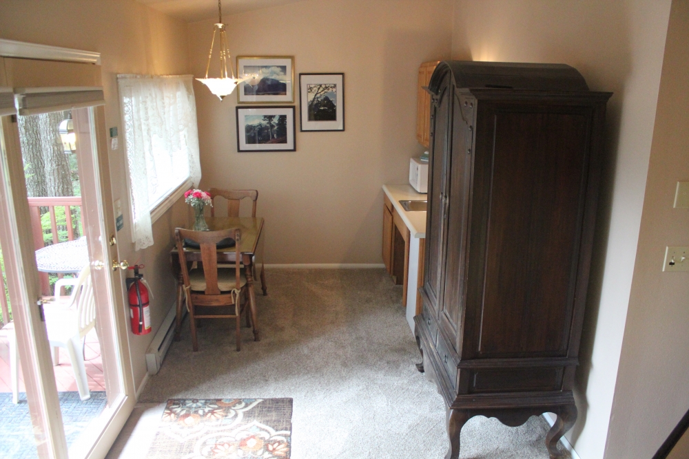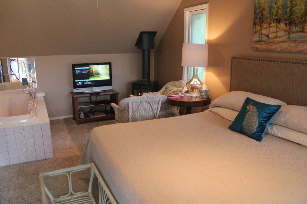 The Mountain Room is our most spacious suite. It has a king-size bed, a romantic gas fireplace, a HUGE two-person whirlpool, shower for two, a beautiful view, private outdoor deck, and absolute privacy! This room also has an alcove with antique table and chairs for breakfast. Large HDTV. Romantic! Romantic! Romantic!